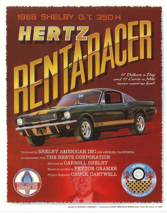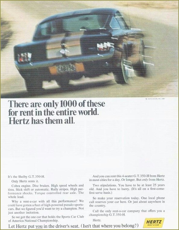 V téže době napadlo kohosi ve společnosti Hertz, jedné z největších amerických autopůjčoven, že by mohlo být zajímavé nabídnout zákazníkům nejen praktickou a pohodlnou přepravu, když jsou zrovna na cestách, ale i nějaké to vzrušení. A co může být větší vzrůšo než Shelby Mustang?