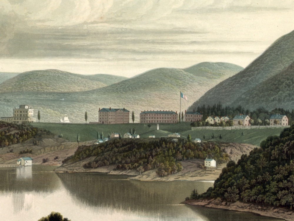 Takto vypadala Akademie West Point na břehu řeky Hudson ve státě New York v roce 1834. Autory malované rytiny jsou George Cooke a W.J.Bennett (Executionhollow.com)