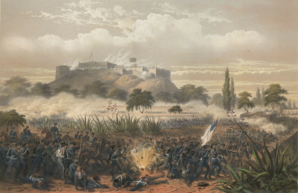 Boj o Chapultepec podle G.Kendalla a C.Nebela. Američané ho dobyli v září 1847 (Wikipedia.org)