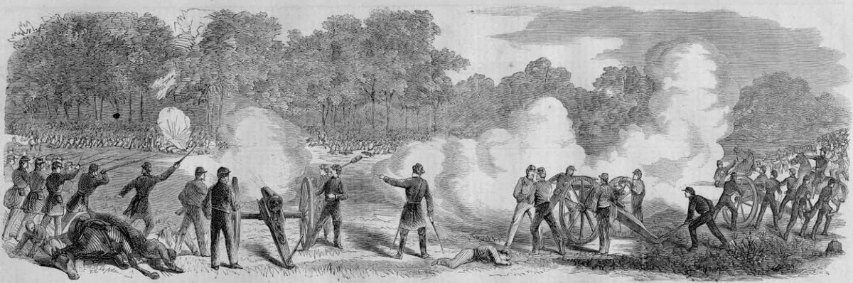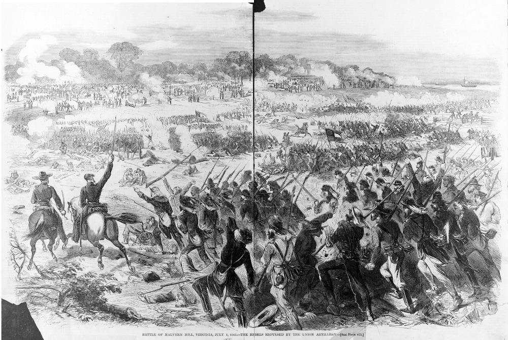 U Malvern Hill se útoky konfederační pěchoty tříštily v palbě federálních děl. Otištěno v Harper’s Weekly (Wikipedia.org)